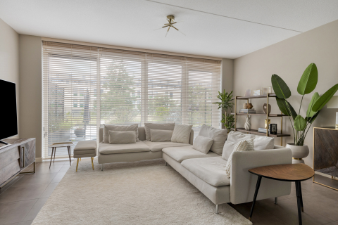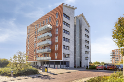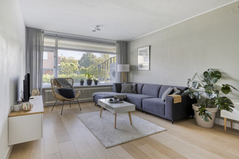 De lichte woonkamer aan de achterzijde is voorzien van openslaande deuren naar het balkon, waar je in alle rust kunt genieten van de buitenlucht. De open keuken is uitgevoerd in hoogglans wit en voorzien van moderne inbouwapparatuur: koelkast met vriesvak, combimagnetron, gaskookplaat, afzuiging, vaatwasser en volledig keukeninventaris.